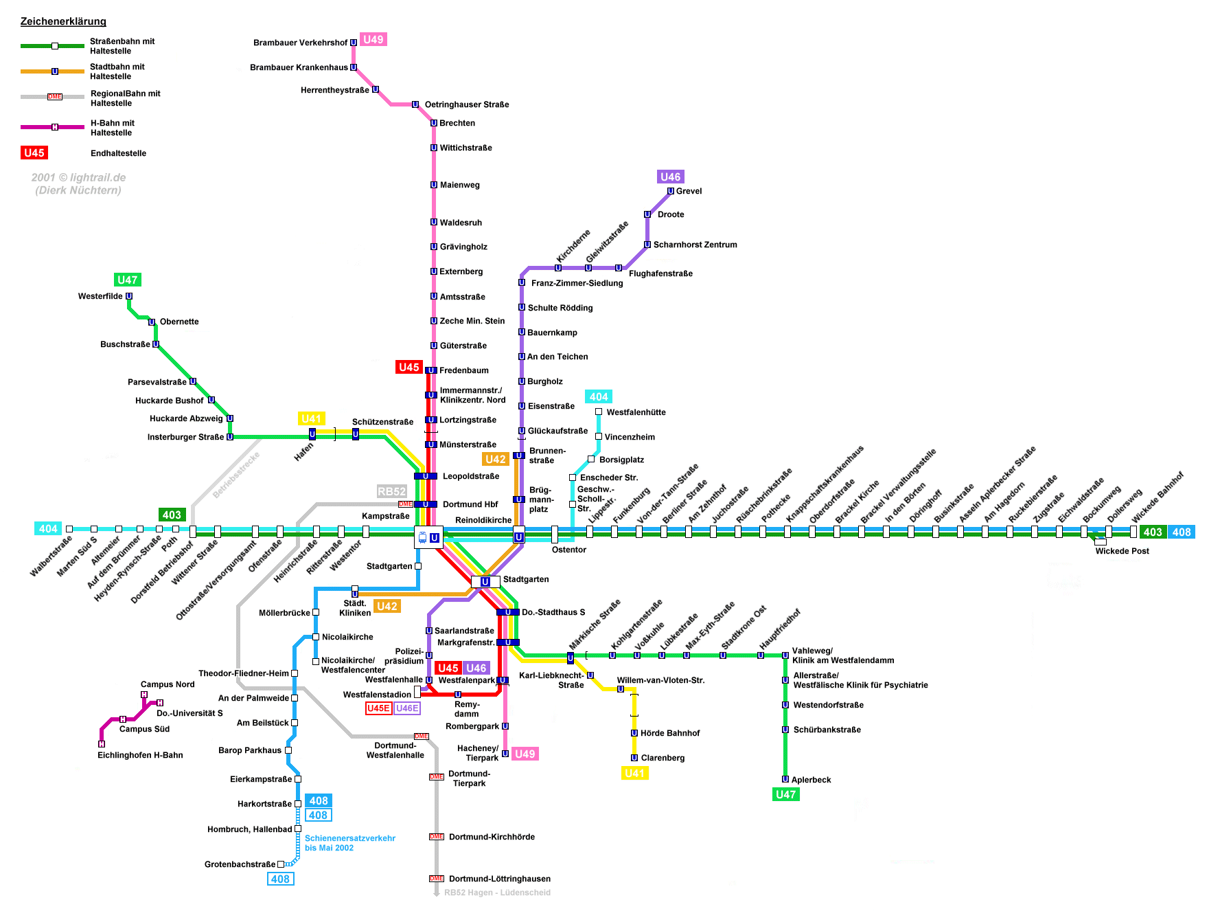 Das Dortmunder Straßenbahn- und Stadtbahnnetz ab dem 6. Januar 2002 Die Stadtbahnstrecke zwischen Dortmund-Brechten und Lünen-Brambauer wurde am 6. Januar 2002 eröffnet. Die Linie U49 fährt nun alle 20 Minuten von Brechten aus weiter bis Brambauer Verkehrshof. Auf der Linie werden nun auch die Fahrzeuge vom Typ B80C/8 eingesetzt. |