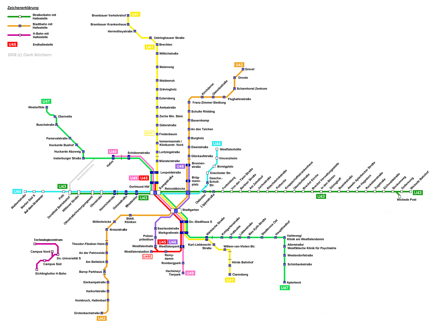 Das Dortmunder Straßenbahn- und Stadtbahnnetz ab dem 27.04.2008 Am 27. April 2008 ist es nun soweit: Der Ost-West-Tunnel in Dortmund mit den Linien U43 und U44 geht in Betrieb. Damit ist Dortmund die einzige Stadt im VRR-Gebiet, die ausschließlich Stadtbahnlinien betreibt. |
