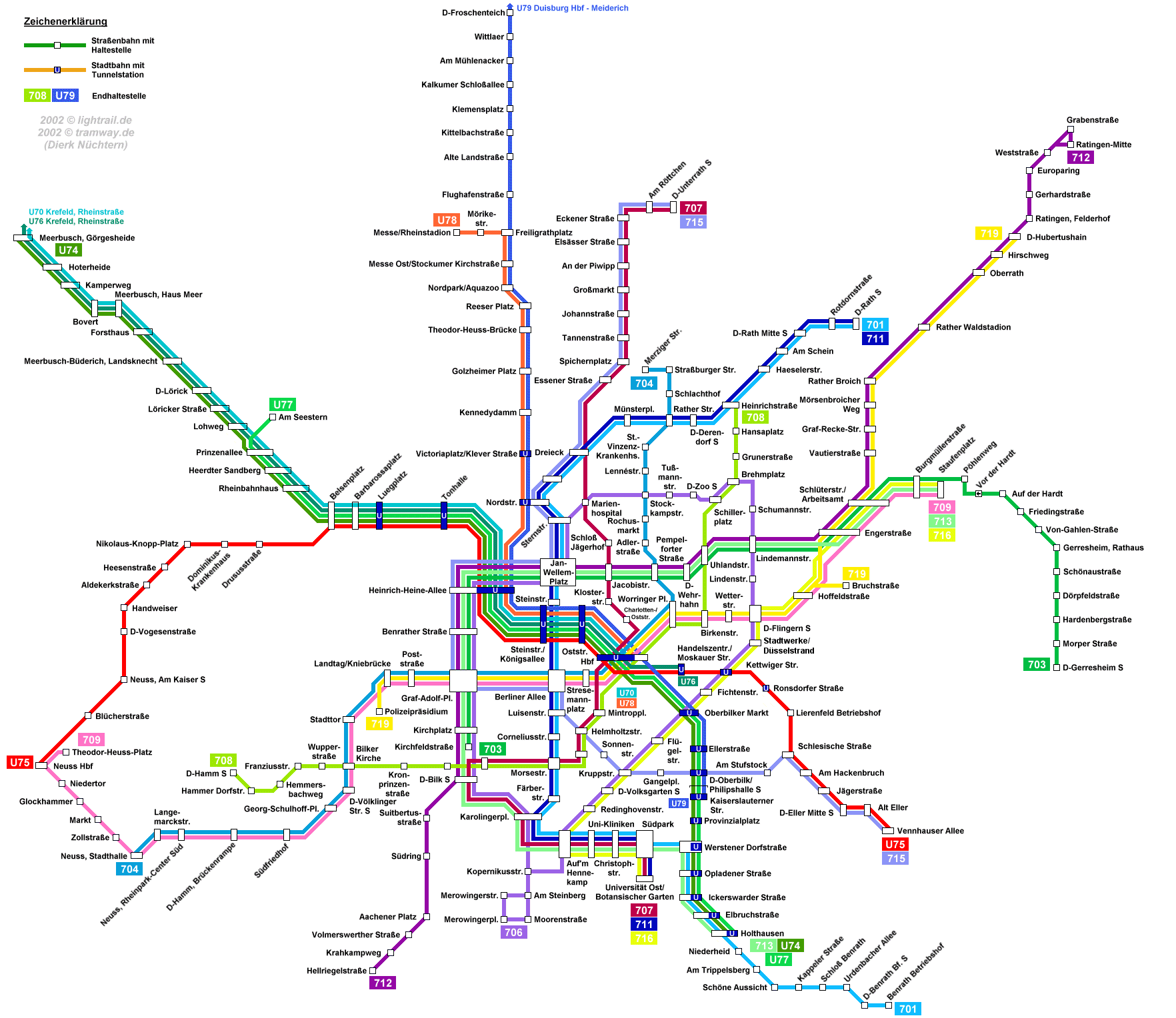 Das Straßenbahnnetz in Düsseldorf seit dem 16.06.02 Mit dem Fahrplanwechsel fahren die Linien U74, U77 und U79 durch den neuen Tunnel bis zur Rampe an der Kaiserslauterner Straße. Hier endet die Linie U79; die U74 und U77 fahren weiter bis Holthausen. |