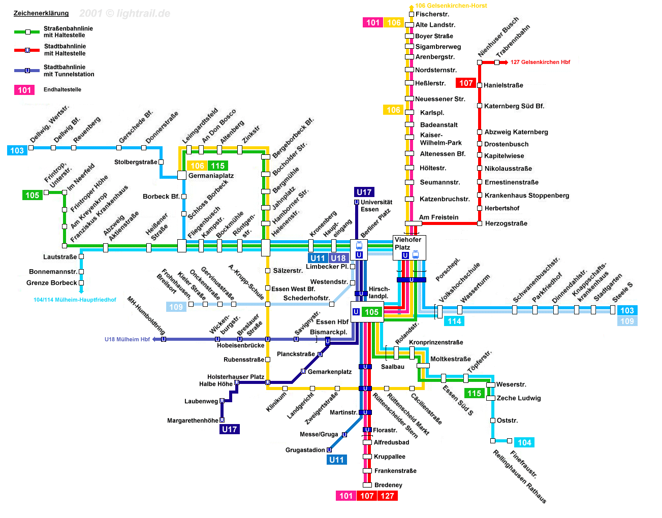 Das Essener Straßenbahn- und Stadtbahnnetz 1986 nach Eröffnung der Linie U11 und der Tunnelstrecke Richtung Bredeney