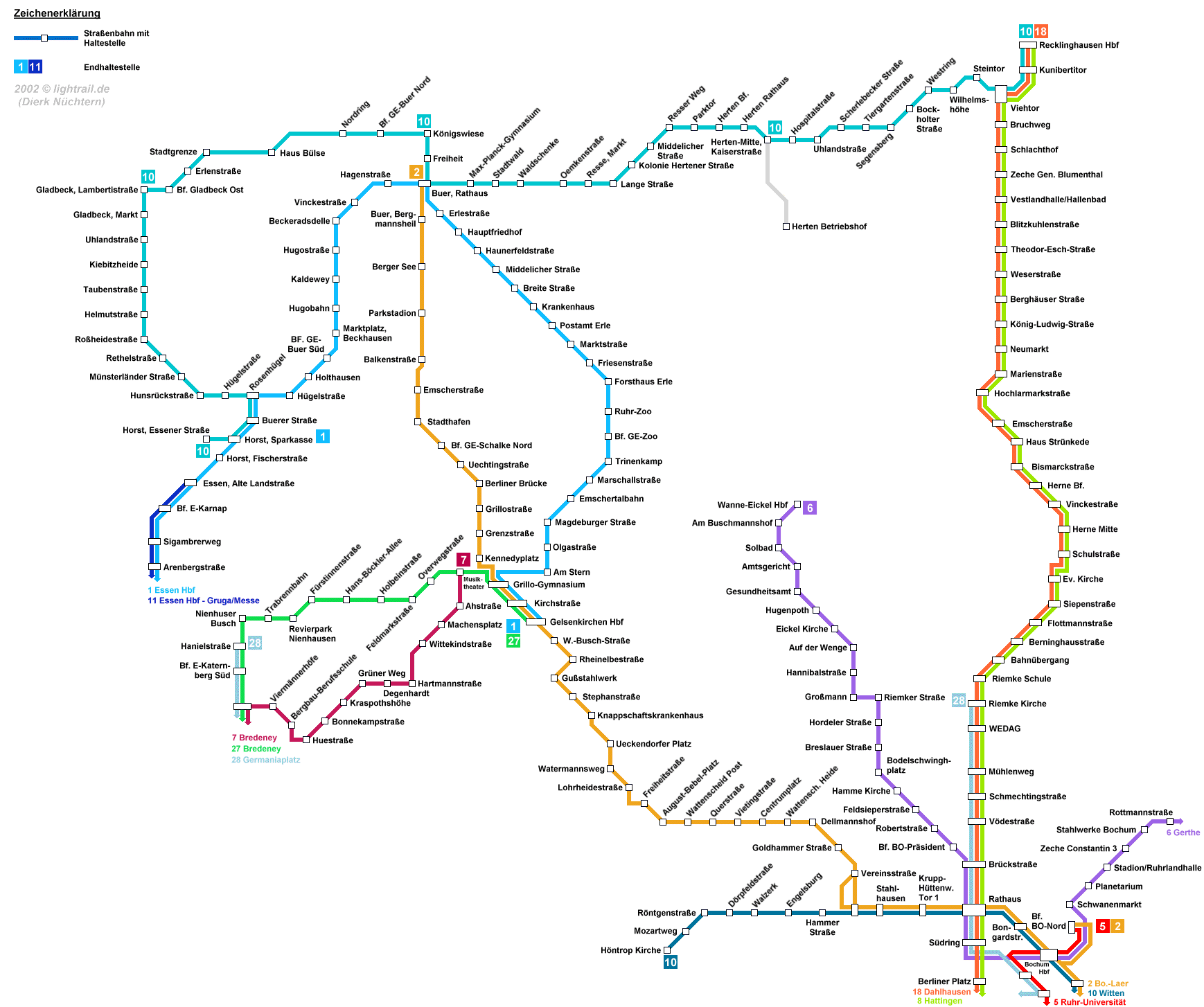 Das Netz der Vestischen Straßenbahnen 1977/78 Neben der Linie 10 Vestischen Straßenbahn sind auch die Gemeinschaftslinien 8 und 18, sowie die Linien der Bochum-Gelsenkirchener Straßenbahn eingezeichnet, die im Bereich Gelsenkirchen und Bochum (nördlicher Teil) verkehren. |