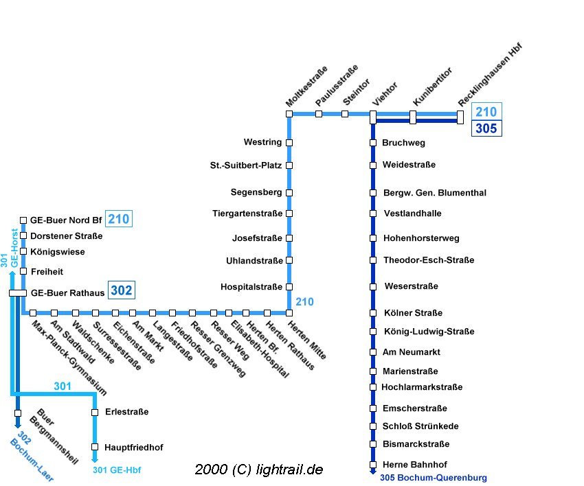 Zur Vereinfachung wurden 1913 Linienbezeichnungen eingeführt. Das Hertener Netz erhielt Ziffern, das Bottroper Netz Buchstaben. In den folgenden Jahren wurde das Liniennetz im Kreis Recklinghausen weiter ausgebaut und am 25. Mai 1925 wurde die Vestischen Kleinbahnen GmbH gegründet. Leider wurden seit den fünfziger Jahren viele Strecken stillgelegt und im Jahre 1975 gab es nur noch 4 Linien. Bis 1980 waren den bis auf zwei Linien alle Straßenbahnstrecken eingestellt worden und es blieben die Linien 210 Recklinghausen - Herten - Buer und 305 Recklinghausen - Herne - Bochum übrig. 1981 wurde die Linie 210 eingestellt und am 30. September 1982 wurde die letzte Straßenbahnstrecke zwischen Recklinghausen und Herne stillgelegt. Pläne die U35 von Herne bis Recklinghausen zu verlängern, scheitern derzeit immer wieder an der Stadt Recklinghausen. |